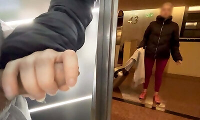 An unknown sporty female from the motel gives me a blowjob in the public elevator and helps me conclude cumming