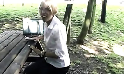 Light-haired hirsute granny outdoor anal