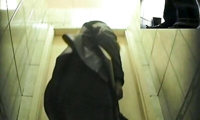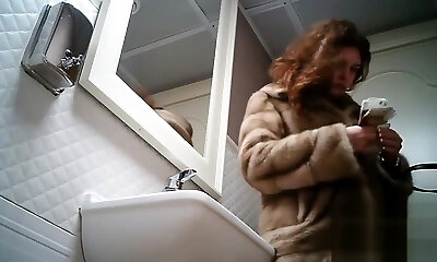 Cute black-haired white chick with immensely hairy pussy spied in the toilet