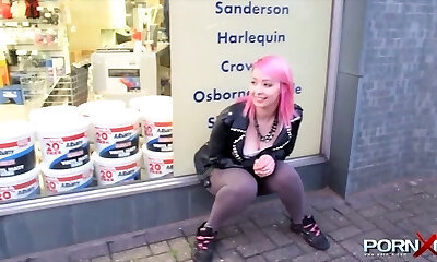 Kinky pink haired goth girlie in tight yoga pants pisses outdoors for stud