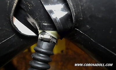 Real Rubber doll oral in condom hood